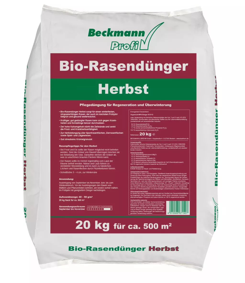 Alkalmazás szeptembertől novemberig, vagy a tél beálltáig. Trágyázás előtt távolítsa el a leveleket és a növényi részeket a gyepről, lehetőleg a biogyeptrágya kijuttatása előtt végezzen fűnyírást. Tavasszal trágyázzon újra Beckmann gyeptrágyával.